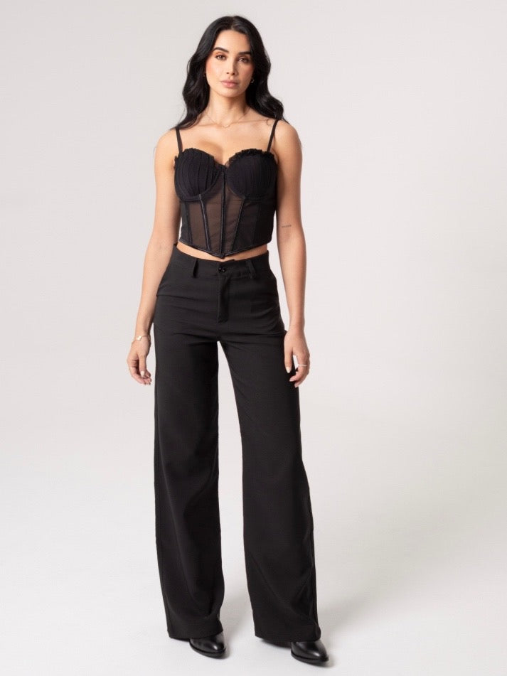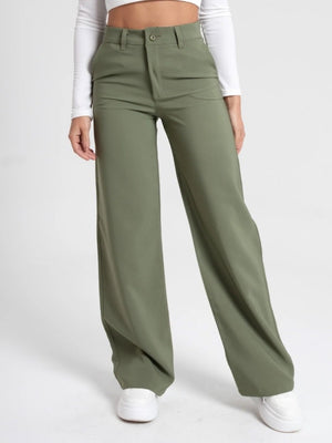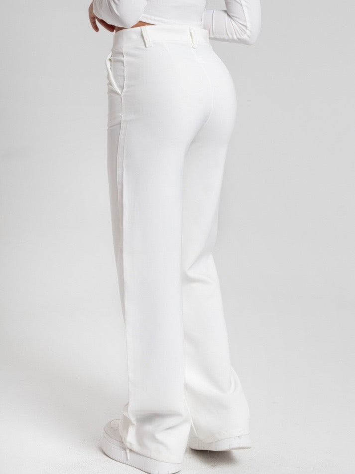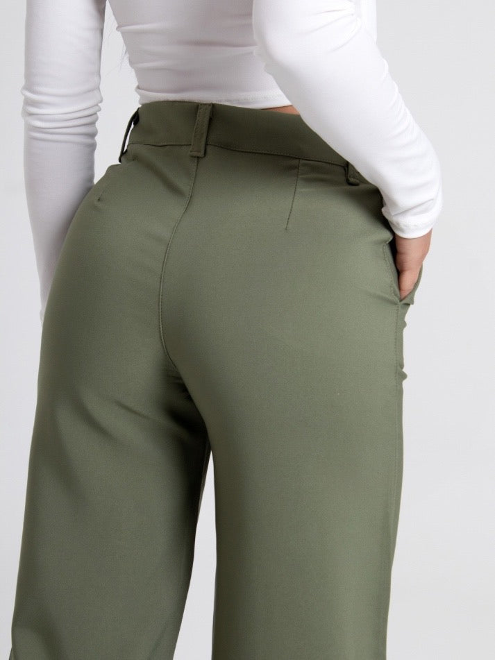 Su diseño de tiro alto marca la cintura y alarga visualmente las piernas, mientras el corte recto aporta equilibrio y un look pulido sin esfuerzo.