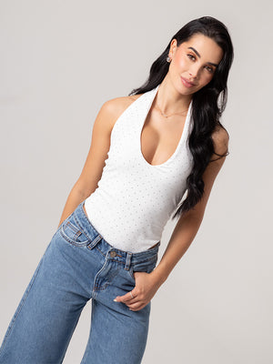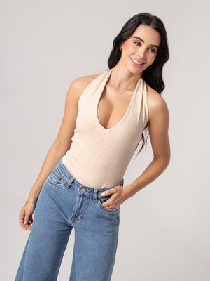 Este body de brillos es esa prenda que transforma cualquier outfit en un look memorable. Su diseño halter con escote delicado resalta tu figura de forma elegante, mientras que la espalda resortada y súper adaptable se ajusta perfecto a tallas S, M y L, garantizando comodidad y un fit impecable.