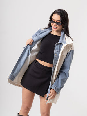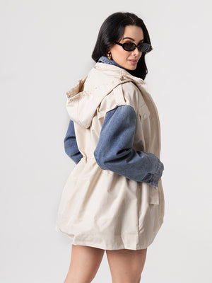 Haz que tu look hable por ti con nuestra parca con detalles en jean, una combinación llamativa que destaca al instante.