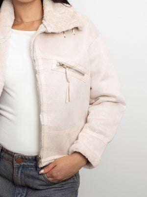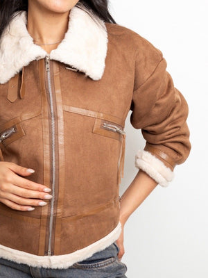 Dale un toque de estilo y calidez a tus looks con esta increíble chaqueta tipo aviador. Confeccionada en suave gamuza color camel, destaca por su interior y cuello de borrego blanco ultra suave, ideal para los días fríos sin perder el estilo.